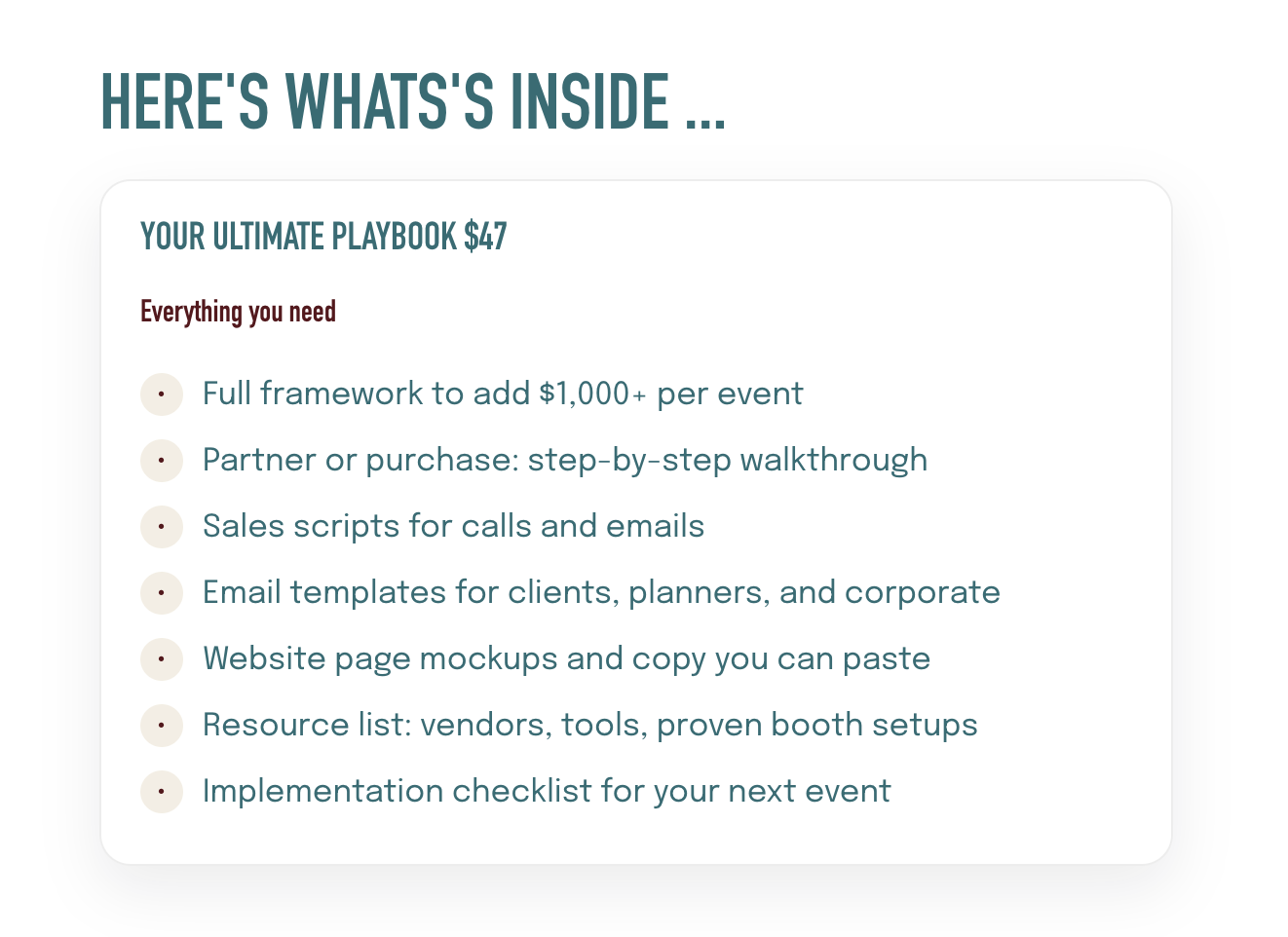 You can add the offer to your packages and site TODAY. Use the checklist provided to book your next event.